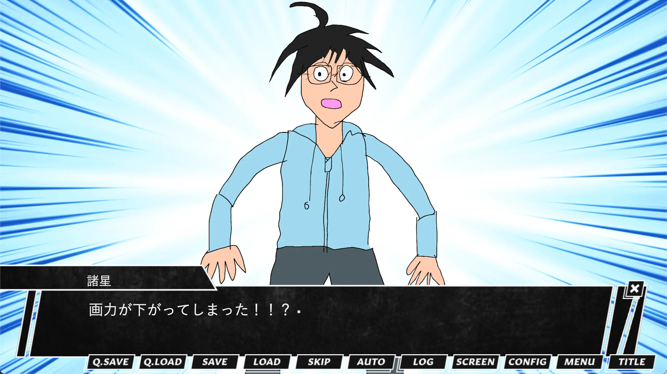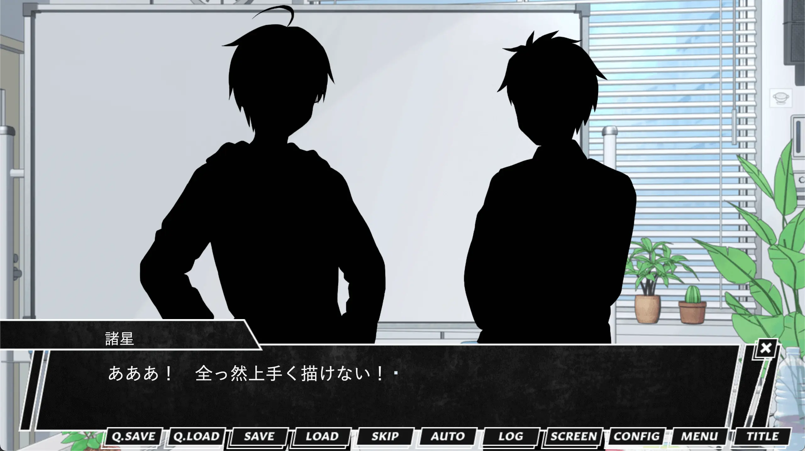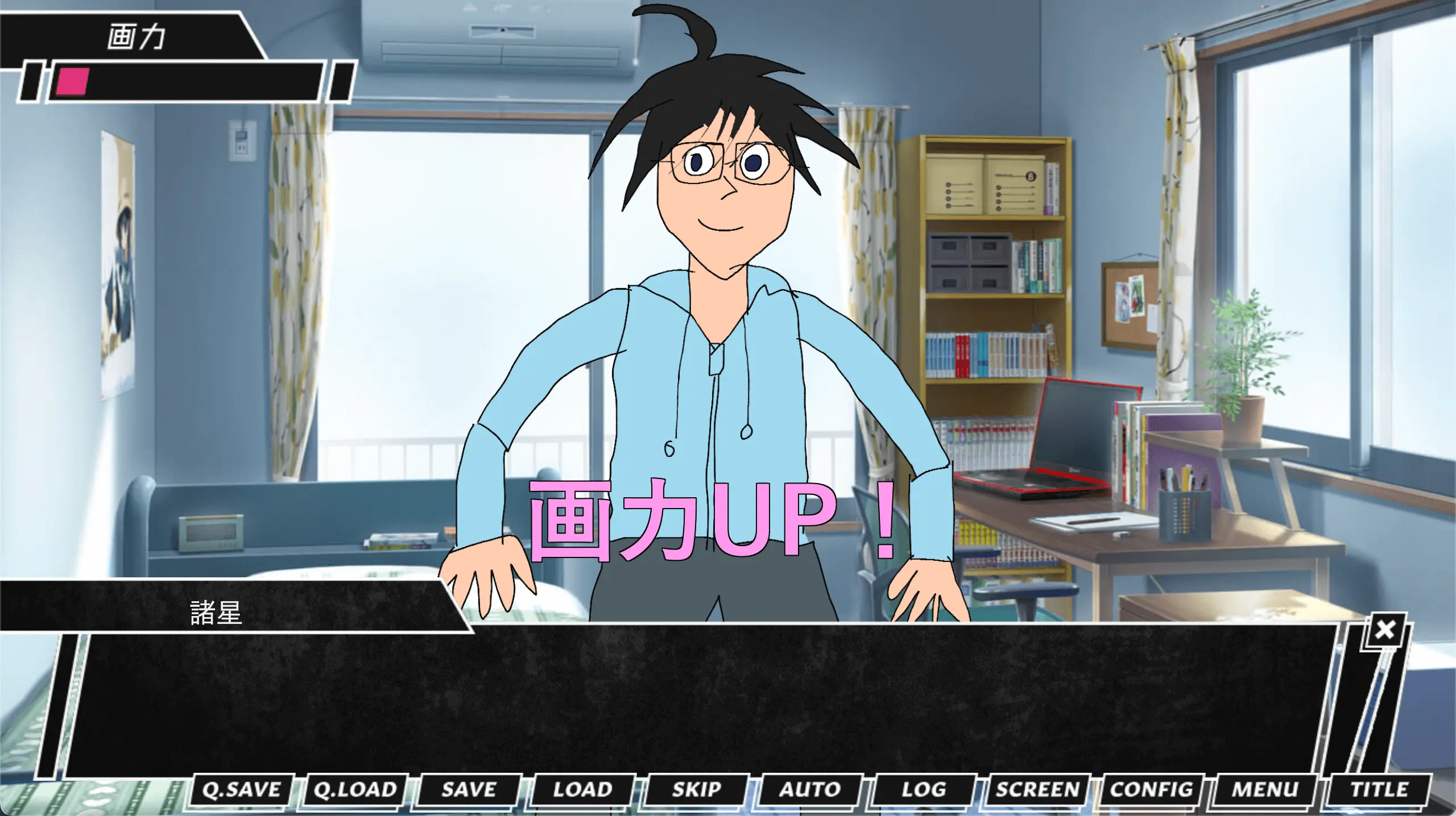 同人サークル「うめぼし」の諸星(もろぼし)と梅井(うめい)は、同人誌即売会に向け、仕事の合間を縫って漫画を描いていた。ある日、諸星の元から突如〈画力〉が失われ、絵を描き始めた頃の絵のような姿になってしまった。探索して絵の描き方を思い出して〈画力〉を上げ、元の姿に戻ろう!
